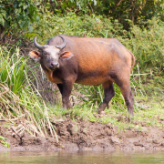 A small herd of the colourful forest buffalo on the edge of the Lango Bai. It is always a good idea to have some distance between yourself and the animals you are viewing.